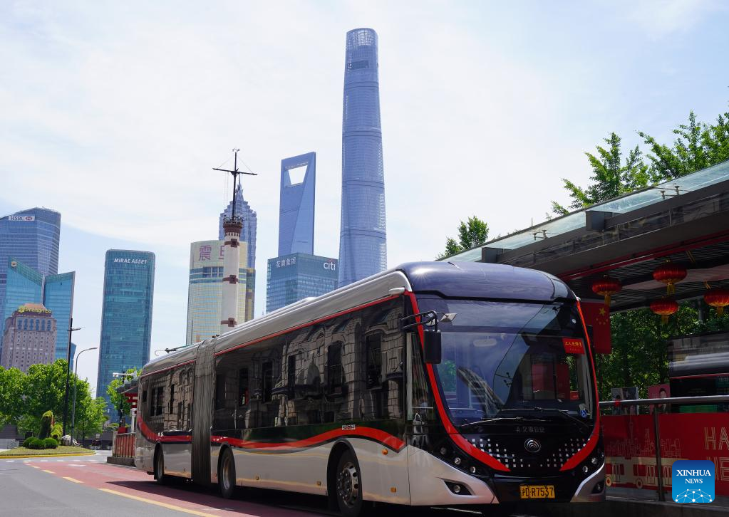 A bus is seen at a bus stop in Shanghai, east China, May 22, 2022. Shanghai started to resume cross-district public transport starting from Sunday.