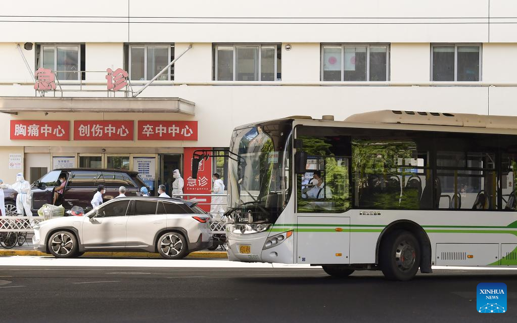 A bus runs past a hospital in Shanghai, east China, May 22, 2022. Shanghai started to resume cross-district public transport starting from Sunday.