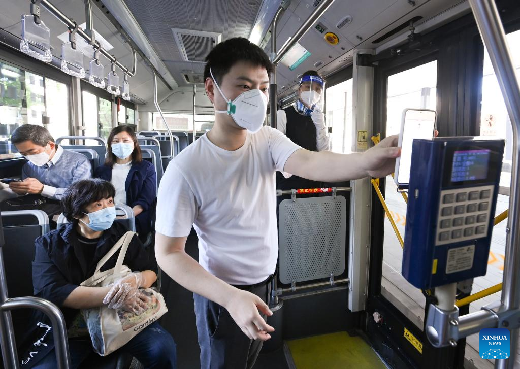 Passengers are seen on a bus in Shanghai, east China, May 22, 2022. Shanghai started to resume cross-district public transport starting from Sunday.