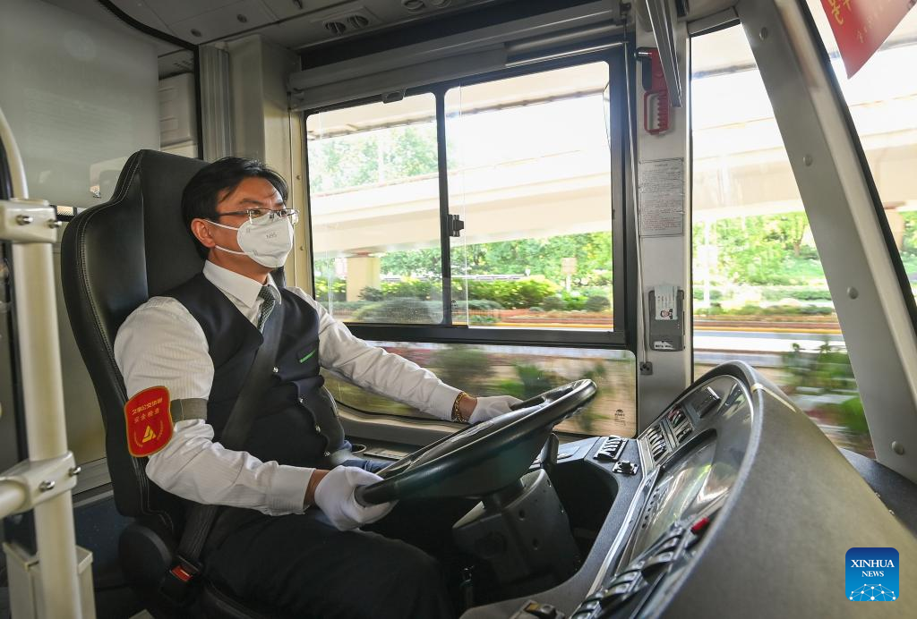 A driver drives a bus in Shanghai, east China, May 22, 2022. Shanghai started to resume cross-district public transport starting from Sunday.