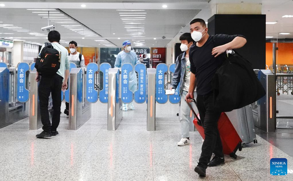 Passengers taking railway transit arrive at Hongqiao Railway Station in Shanghai, east China, May 22, 2022. Shanghai started to resume cross-district public transport starting from Sunday.