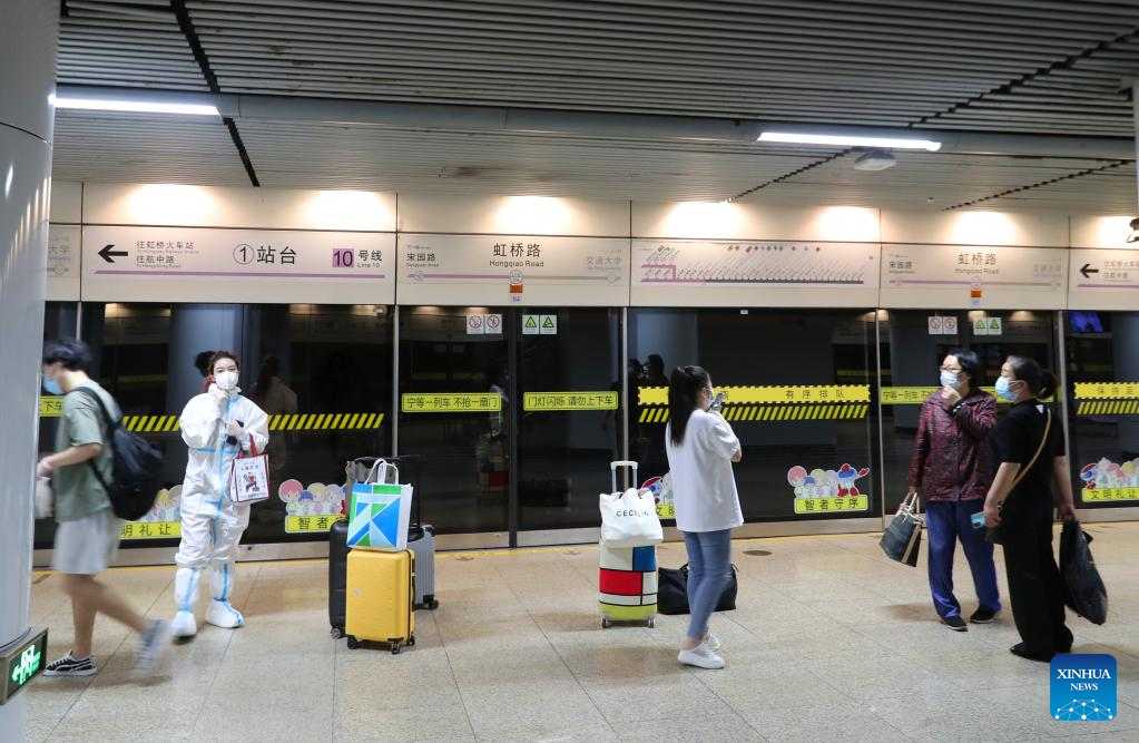 Passengers are seen at Hongqiao Road Station on subway Line 10, in Shanghai, east China, May 22, 2022. Shanghai started to resume cross-district public transport starting from Sunday.
