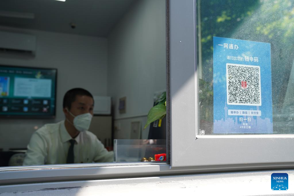 A QR code is seen at a bus stop in Shanghai, east China, May 22, 2022. Shanghai started to resume cross-district public transport starting from Sunday.