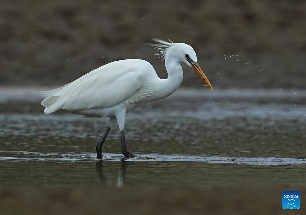 (220522) -- FUZHOU, May 22, 2022 (Xinhua) -- An egret forages in the Minjiang River estuary nature reserve in southeast China's Fujian Province, May 21, 2022. Located on a major bird migration route between East Asia and Australia, the Minjiang River estuary nature reserve is a stopover for over 50,000 waterfowls each year. (Xinhua/Wei Peiquan)