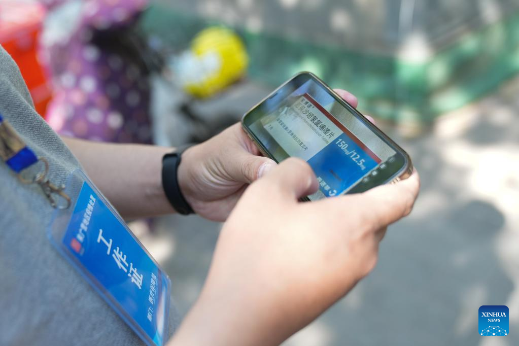 Mei Xiaodong checks the medicine ordered by residents via Wechat on the phone in Chaoyang District in Beijing, capital of China, May 21, 2022.
