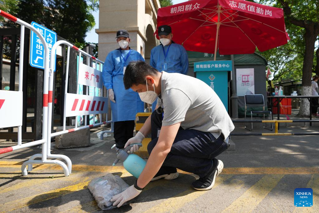 Mei Xiaodong arranges and disinfects the medicine ordered by residents at a community in Chaoyang District in Beijing, capital of China, May 21, 2022.