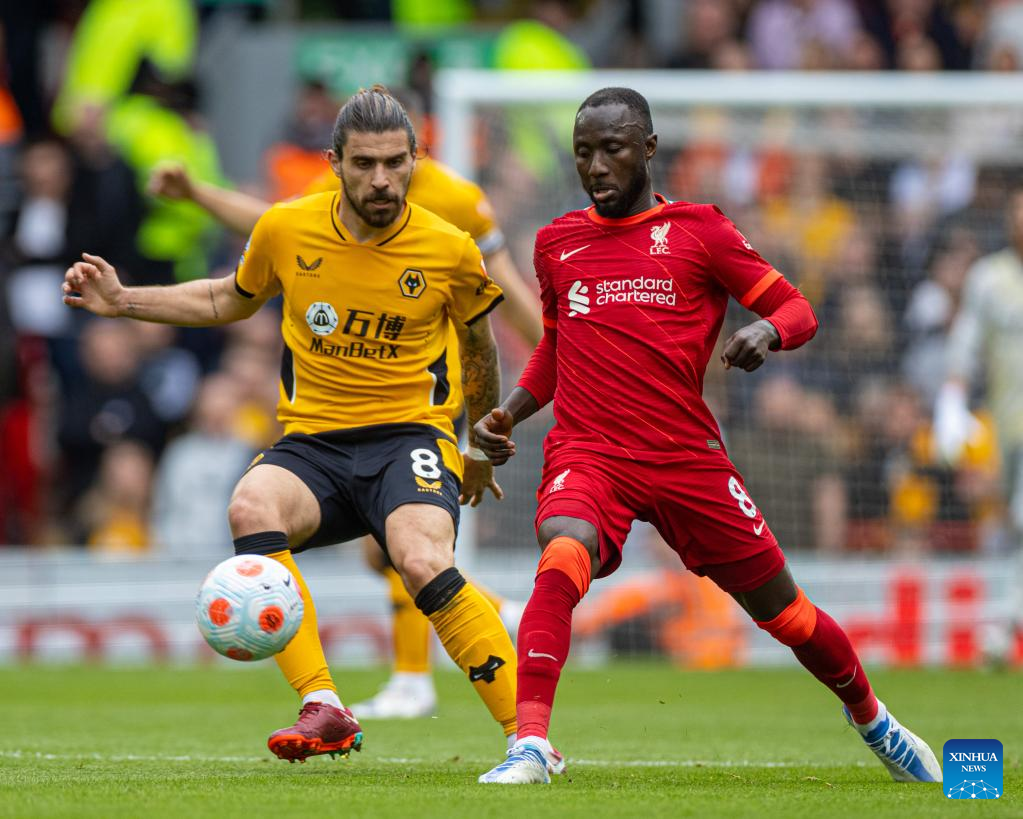 Liverpool's Naby Keita (R) vies with Wolverhampton Wanderers' Ruben Neves during the English Premier League match between Liverpool and Wolverhampton Wanderers in Liverpool, Britain, on May 22, 2022. (Xinhua)