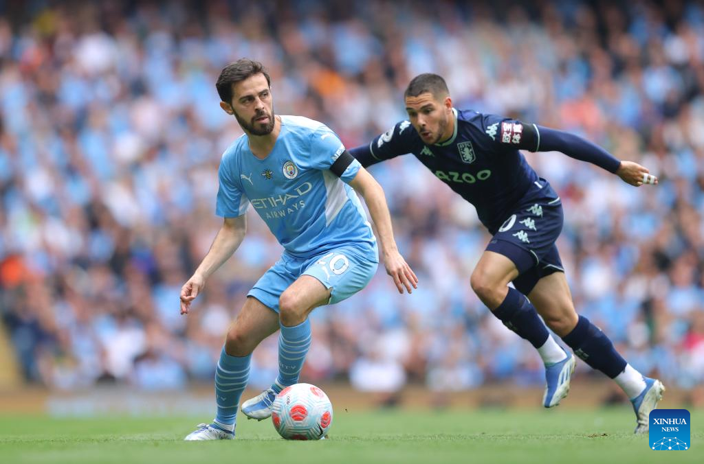 Bernardo Silva (L) of Manchester City turns from Emi Buendia of Aston Villa during the English Premier League football match between Manchester City and Aston Villa in Manchester, Britain, May 22, 2022. (Xinhua)