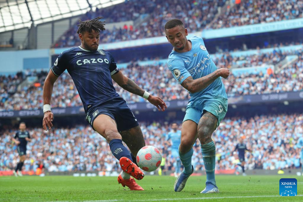Tyrone Mings of Aston Villa (L) tackles Gabriel Jesus of Manchester City during the English Premier League match between Manchester City and Aston Villa in Manchester, Britain, May 22, 2022. (Xinhua)