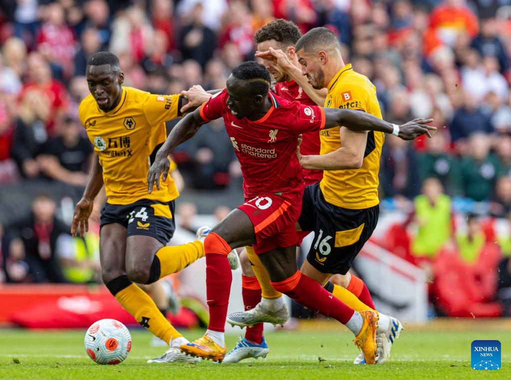 Liverpool's Sadio Mane (Front) gets past two Wolverhampton Wanderers players during the English Premier League match between Liverpool and Wolverhampton Wanderers in Liverpool, Britain, on May 22, 2022. (Xinhua)