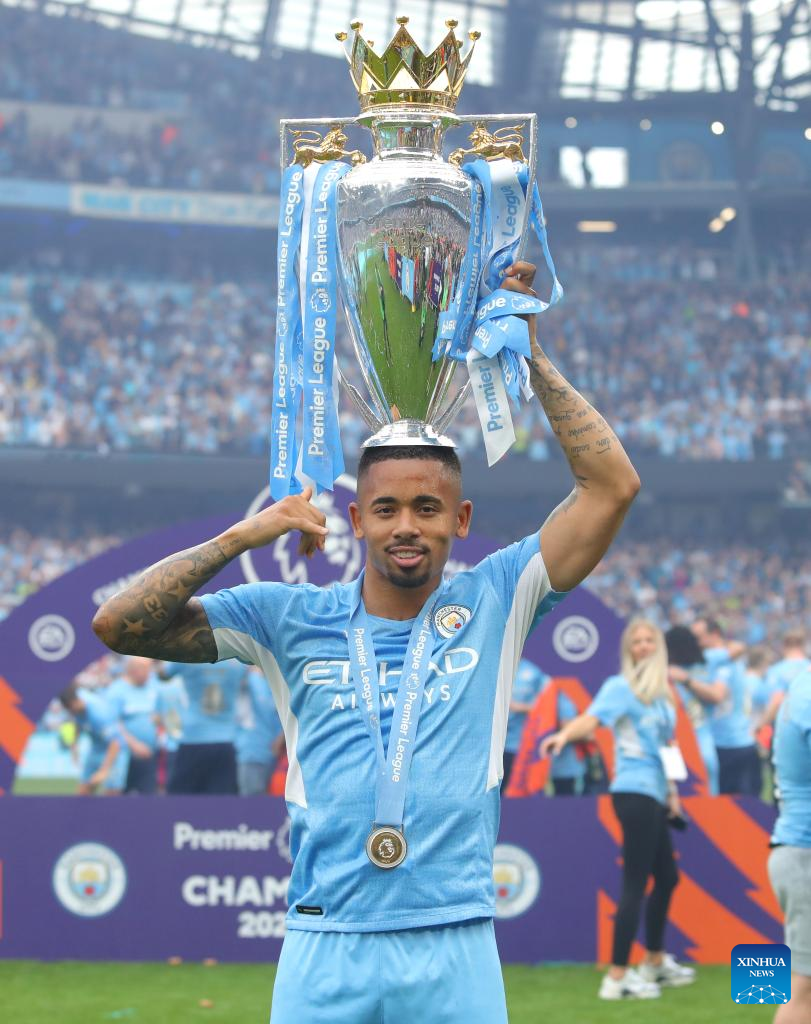 Gabriel Jesus of Manchester City lifts the trophy as he celebrates winning the Premier League after beating Aston Villa during their English Premier League match in Manchester, Britain, May 22, 2022. (Xinhua)