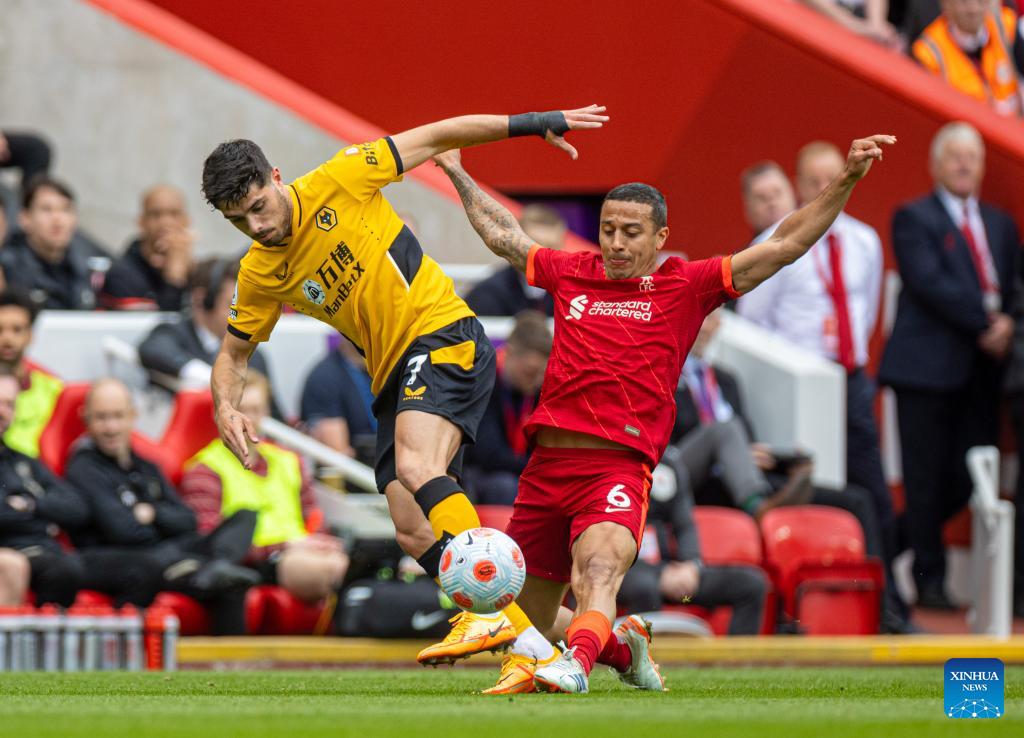 Wolverhampton Wanderers' Pedro Neto (L) is challenged by Liverpool's Thiago Alcantara during the English Premier League match between Liverpool and Wolverhampton Wanderers in Liverpool, Britain, on May 22, 2022. (Xinhua)