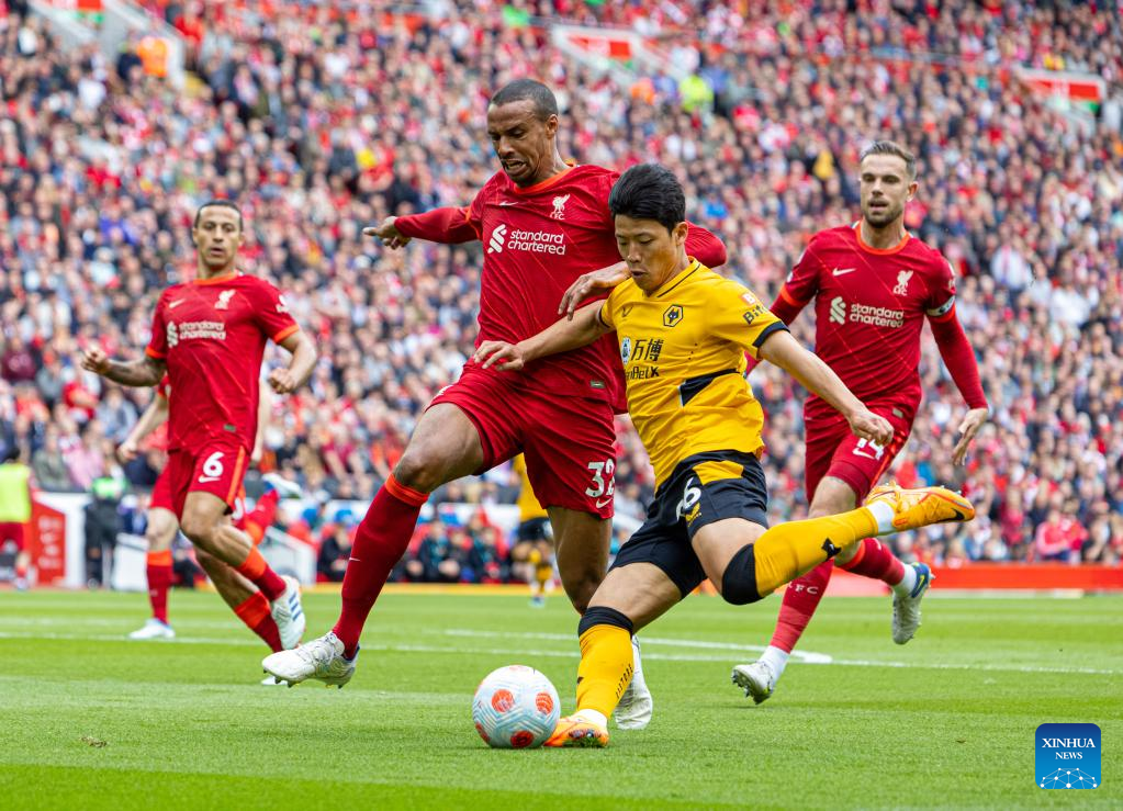 Liverpool's Joel Matip (L, front) vies with Wolverhampton Wanderers' Hwang Hee-chan (R, front) during the English Premier League match between Liverpool and Wolverhampton Wanderers in Liverpool, Britain, on May 22, 2022. (Xinhua)