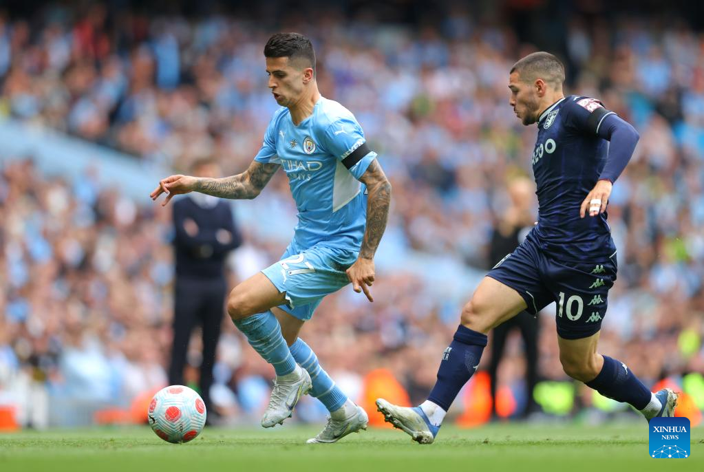 Joao Cancelo (L) of Manchester City is challenged by Emi Buendia of Aston Villa during the English Premier League football match between Manchester City and Aston Villa in Manchester, Britain, May 22, 2022. (Xinhua)