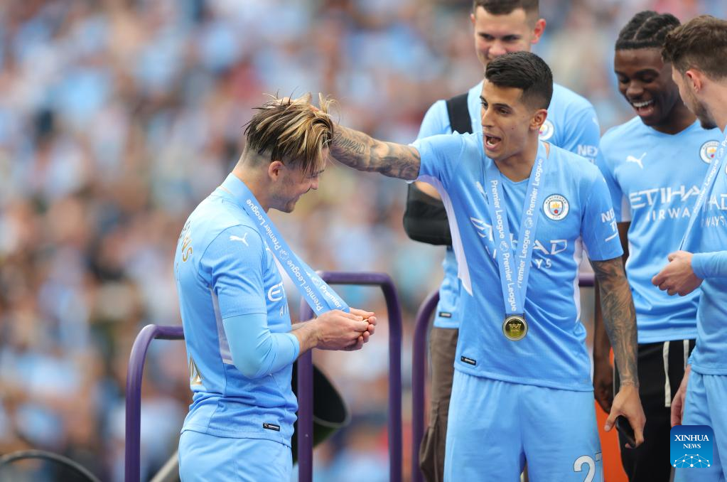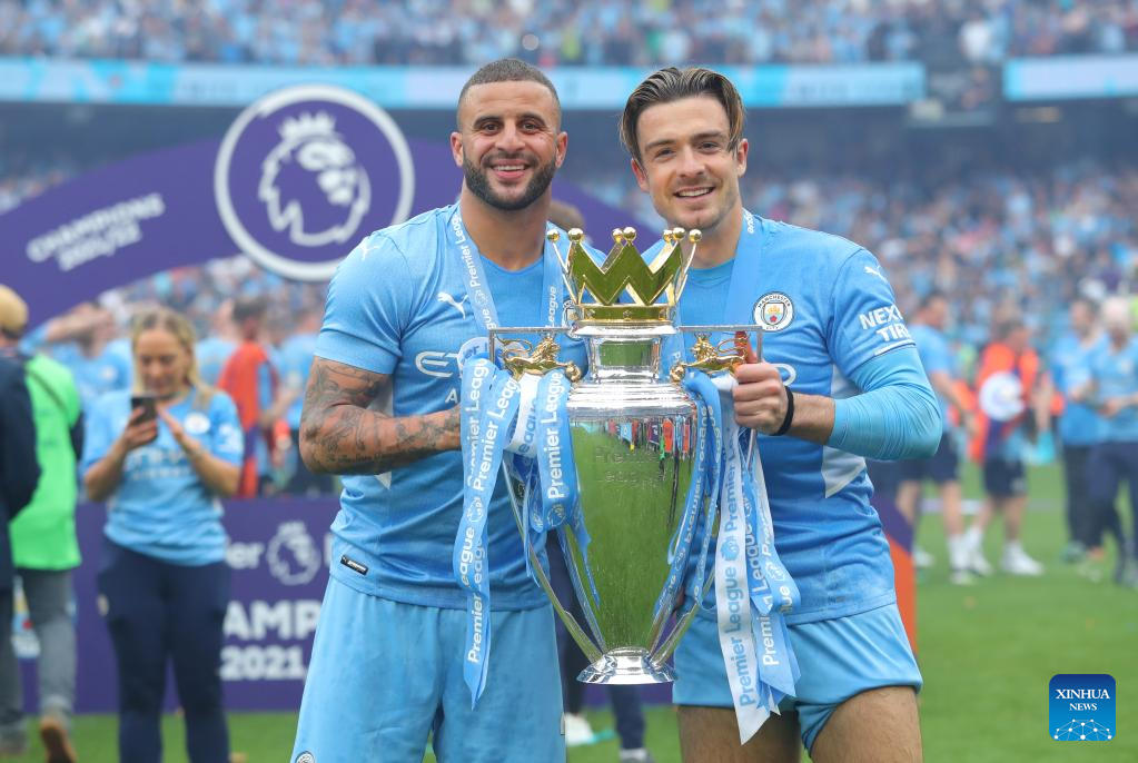Kyle Walker (L) and Jack Grealish of Manchester City hold the trophy as they celebrate winning the Premier League after beating Aston Villa during their English Premier League match in Manchester, Britain, May 22, 2022. (Xinhua)
