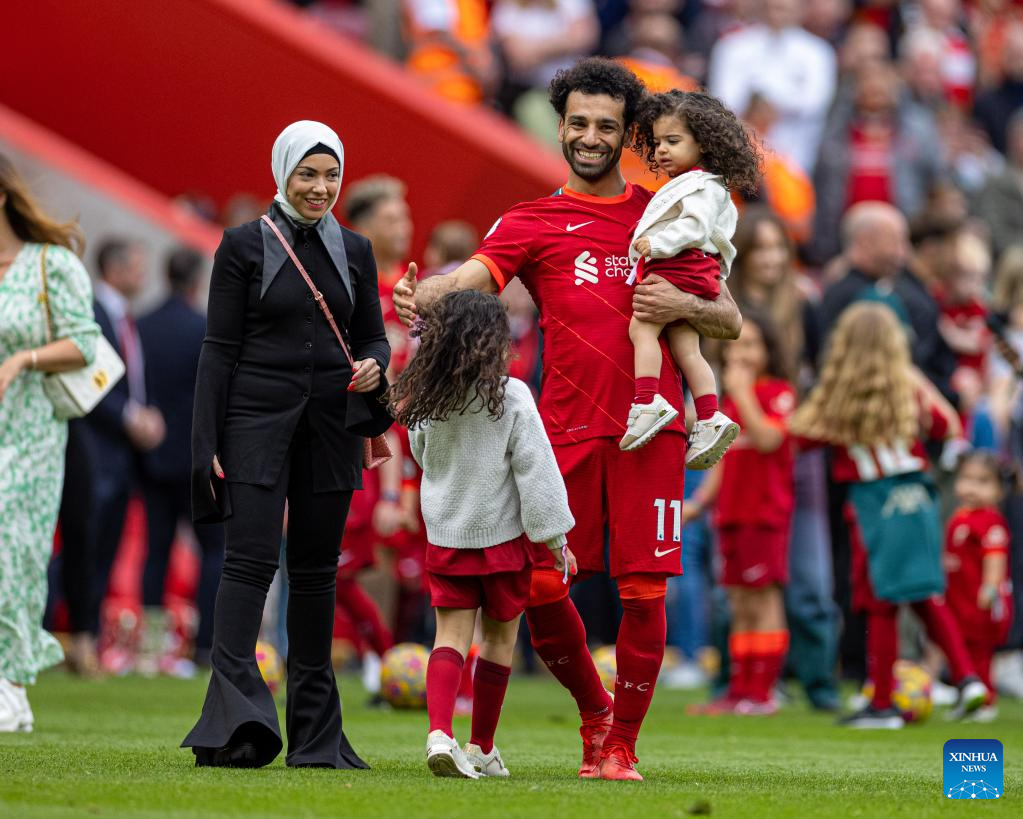 Liverpool's Mohamed Salah and his family are seen on the pitch after the English Premier League match between Liverpool and Wolverhampton Wanderers in Liverpool, Britain, on May 22, 2022. (Xinhua)
