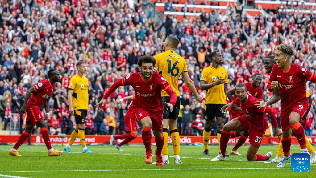 Liverpool's Mohamed Salah (Front) celebrates after scoring the second goal during the English Premier League match between Liverpool and Wolverhampton Wanderers in Liverpool, Britain, on May 22, 2022. (Xinhua)