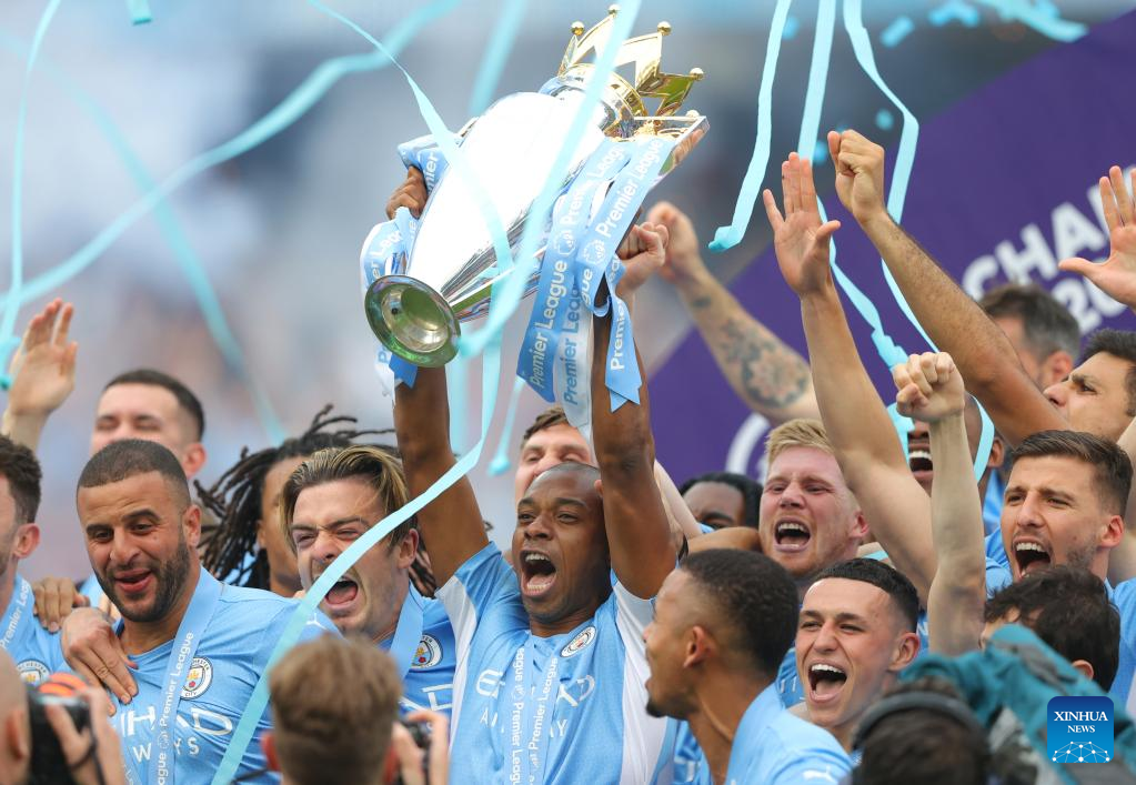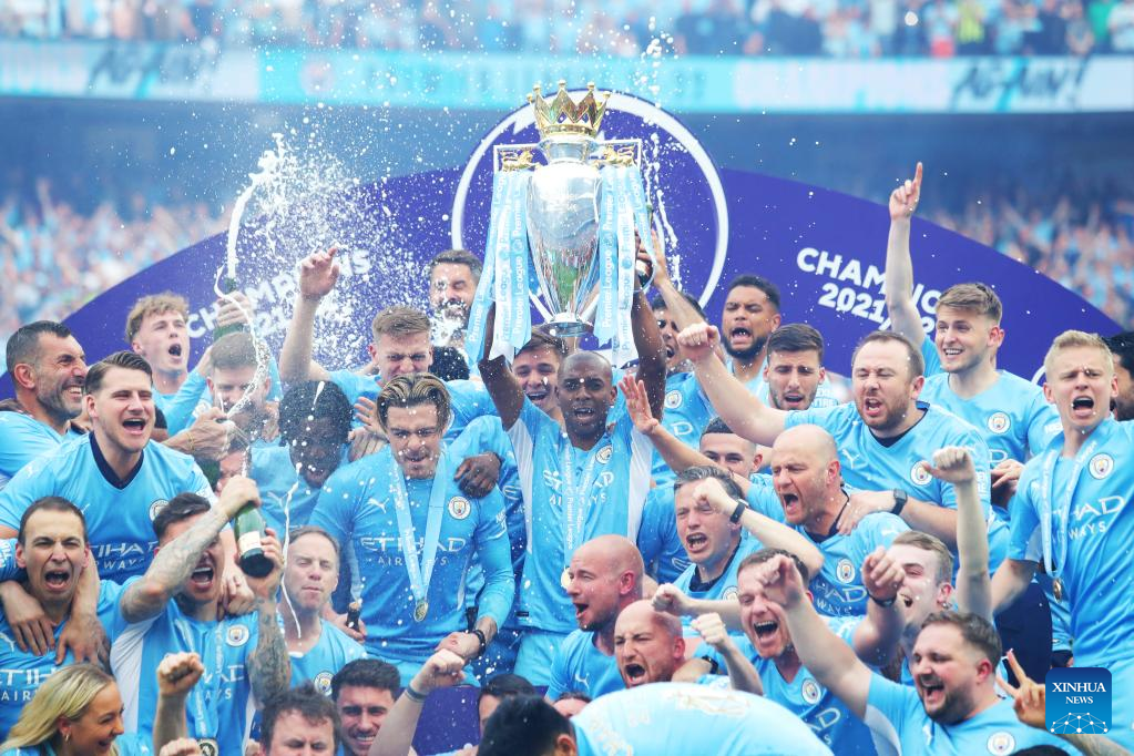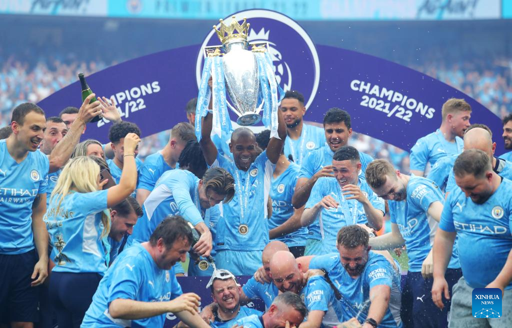 Fernandinho (C) of Manchester City lifts the trophy as he celebrates winning the Premier League with his teammates after beating Aston Villa during their English Premier League match in Manchester, Britain, May 22, 2022. (Xinhua)