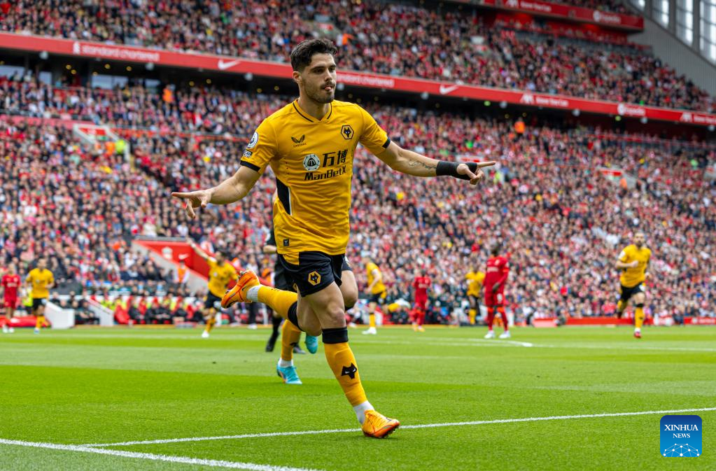 Wolverhampton Wanderers' Pedro Neto celebrates after scoring the opening goal during the English Premier League match between Liverpool and Wolverhampton Wanderers in Liverpool, Britain, on May 22, 2022. (Xinhua)