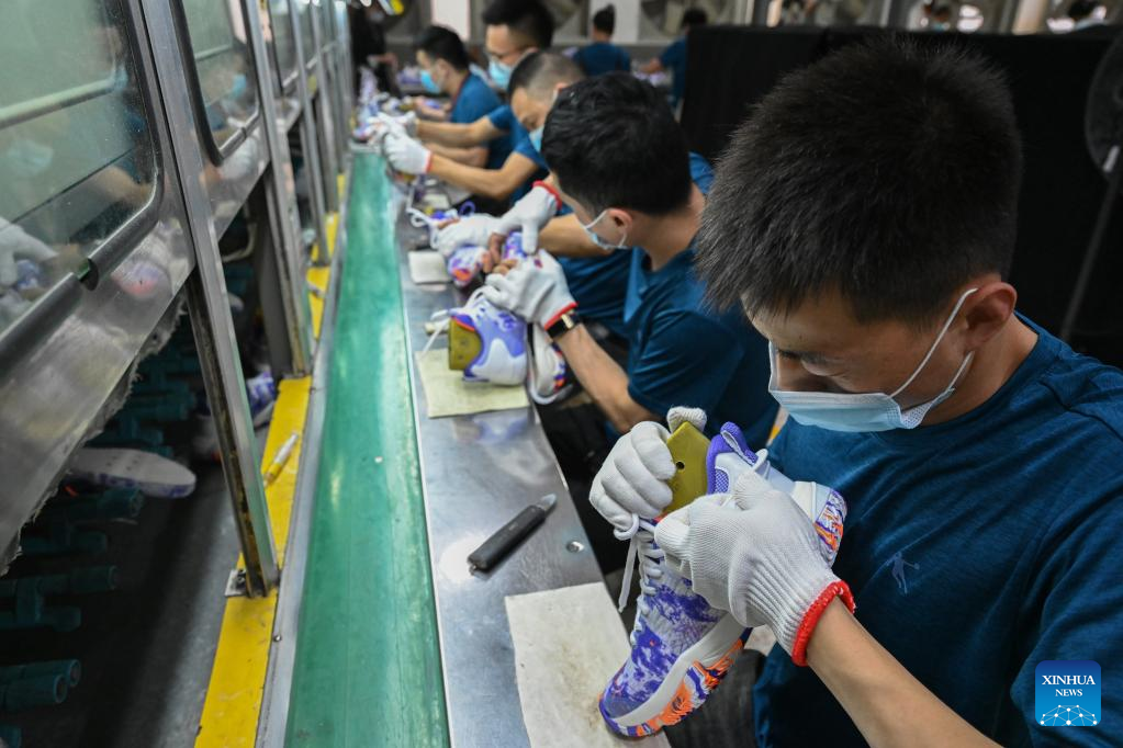 Staff members work on a production line in a sports shoe company in Jinjiang City, southeast China's Fujian Province, May 14, 2022. (Photo/Xinhua)