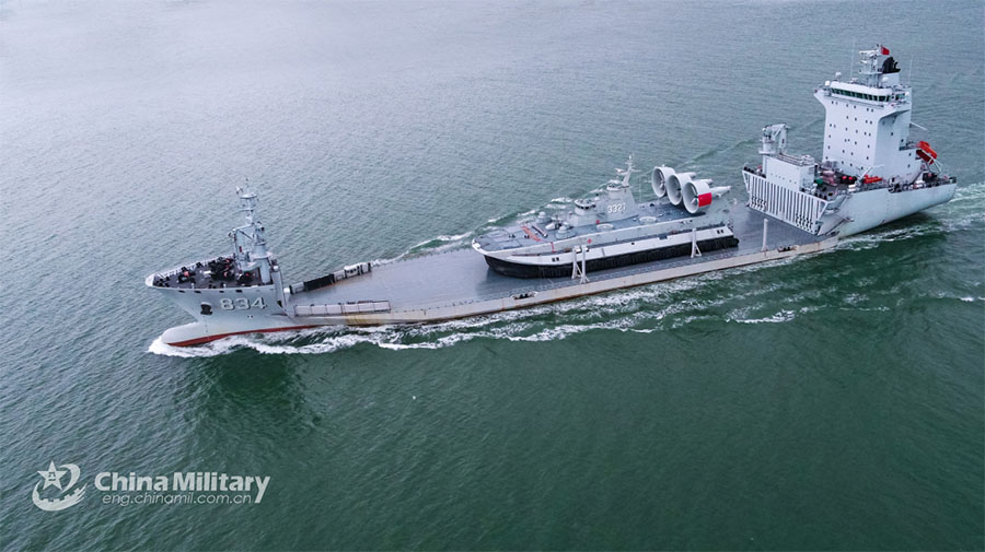 The minesweeper Suizhou (Hull 834) attached to a landing ship group with the navy under the PLA Southern Theater Command transports an air-cushioned landing craft (LCAC) to a specific location during the maritime transportation training on May 14, 2022. (eng.chinamil.com.cn/Photo by Li Jia)
