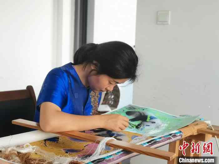 Liu Daohua, a craftswoman, embroiders a giant panda image onto a piece of Shu brocade designed with the application of artificial intelligence (AI) technologies. (Chinanews.com/Wang Liwen)