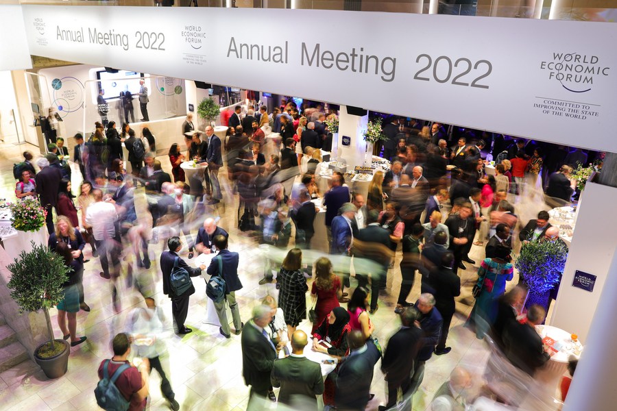 Participants attend the welcome reception in the Congress Center for the World Economic Forum (WEF) 2022 Annual Meeting in Davos, Switzerland, May 22, 2022. The WEF 2022 Annual Meeting is held here from May 22 to 26. (Xinhua/Zheng Huansong)