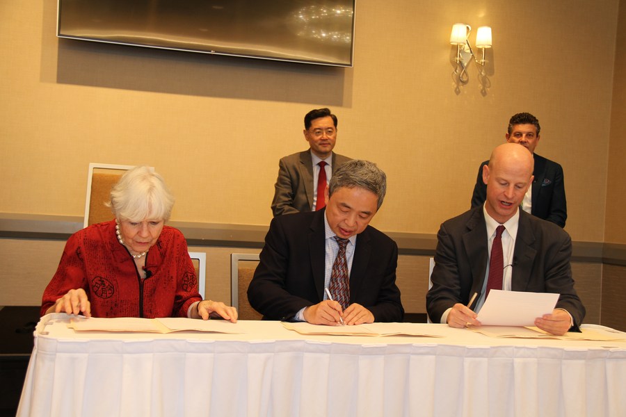 Sarah Lande (1st L) and Wanxiang America Corporation President Ni Pin (C, Front) sign the agreement of the "Sarah and Roger Lande Scholars" Program in Muscatine, Iowa, the United States, on April 20, 2022. (Xinhua/Xu Jing)