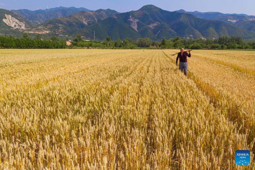 A farmer checks wheat in the fields in Yitong Village of Yuncheng, north China's Shanxi Province, May 19, 2022. (Photo by Jiang Hua/Xinhua)