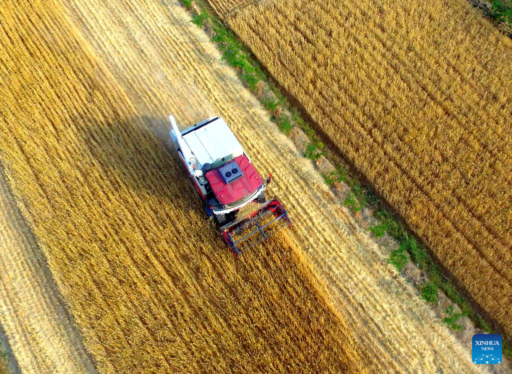 Aerial photo taken on May 24, 2022 shows farmers harvesting wheat in the fields in Xiapo Village of Linyi, east China's Shandong Province. (Photo by Wu Jiquan/Xinhua)