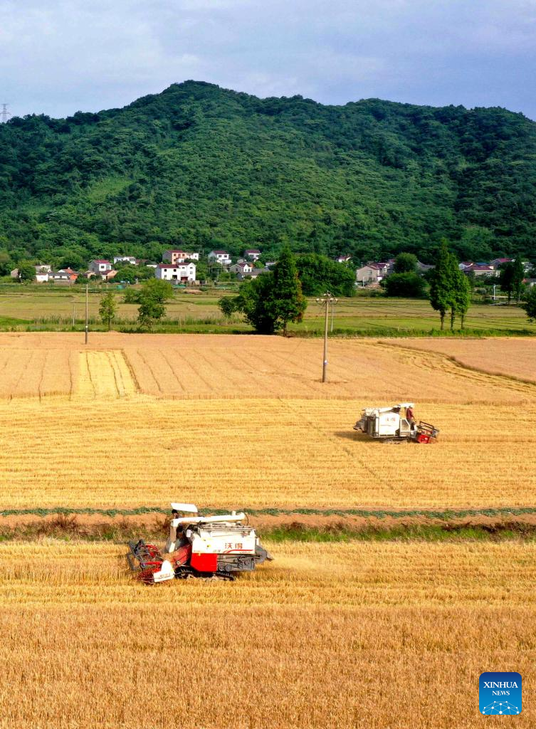 Farmers harvest wheat in the fields in Chaitang Village of Tongling, east China's Anhui Province, May 23, 2022. (Photo by Guo Shining/Xinhua)