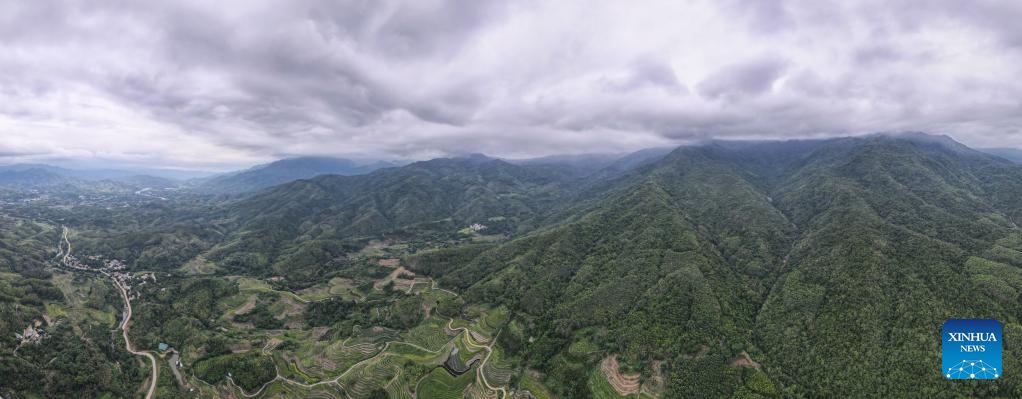 Aerial panoramic photo taken on May 18, 2022 shows a view of paddy fields in Shuiman Town of Wuzhishan City, south China's Hainan Province. (Xinhua/Zhang Liyun)