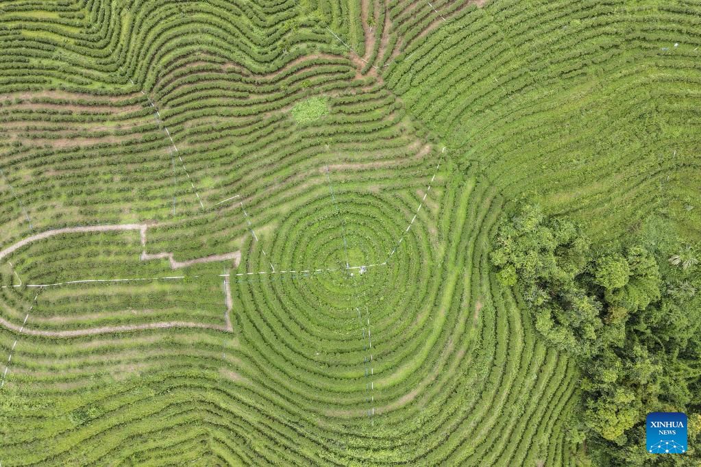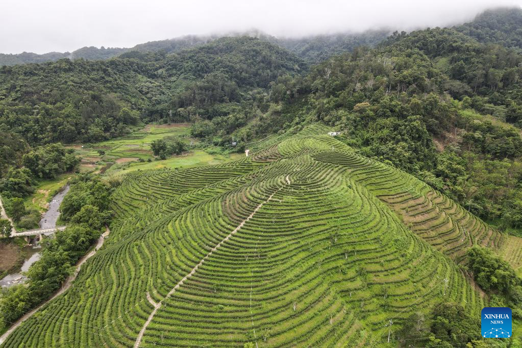 Aerial photo taken on May 18, 2022 shows a view of a tea garden in Wuzhishan City, south China's Hainan Province. (Xinhua/Zhang Liyun)