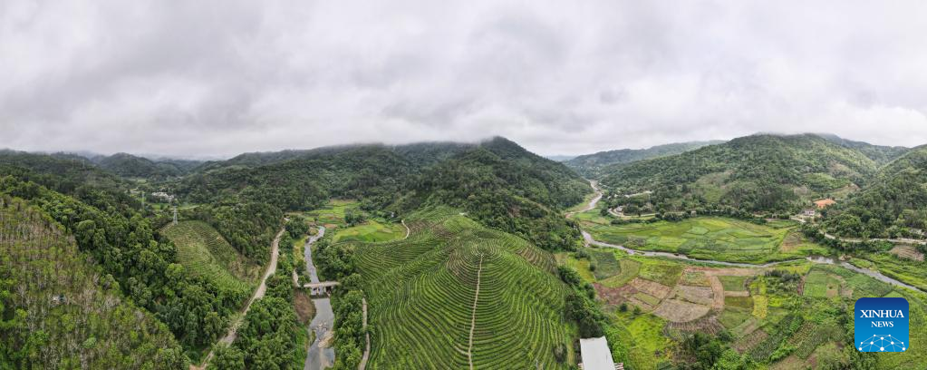Aerial panoramic photo taken on May 18, 2022 shows a view of a tea garden in Wuzhishan City, south China's Hainan Province. (Xinhua/Zhang Liyun)