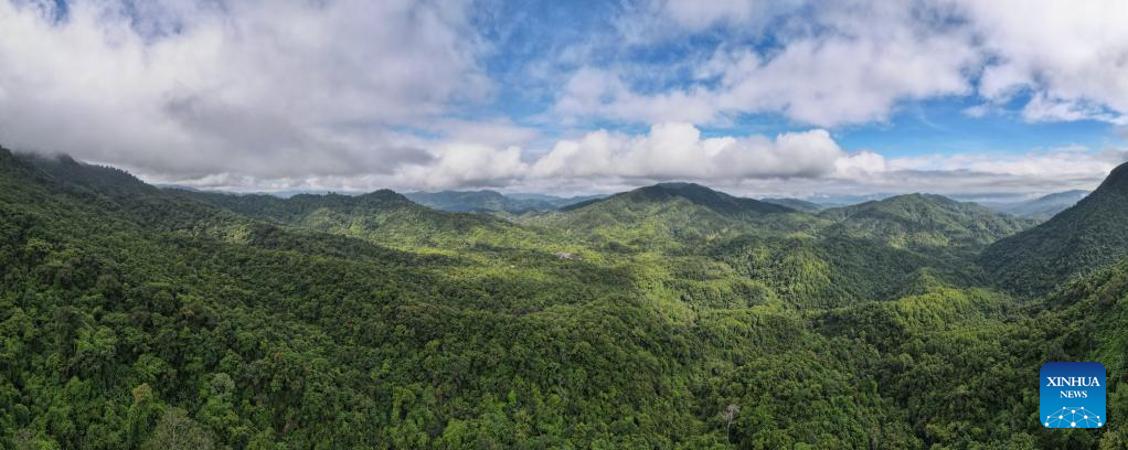 Aerial panoramic photo taken on May 19, 2022 shows a view of the Wuzhishan section of the Hainan Tropical Rainforest National Park in Wuzhishan City, south China's Hainan Province. (Xinhua/Zhang Liyun)