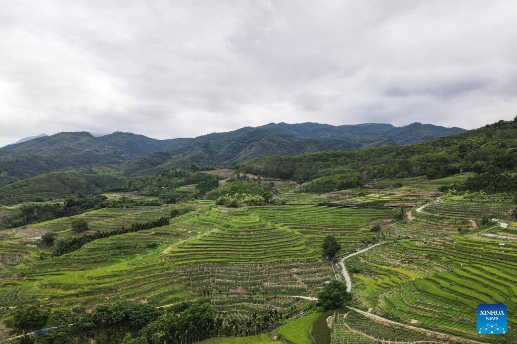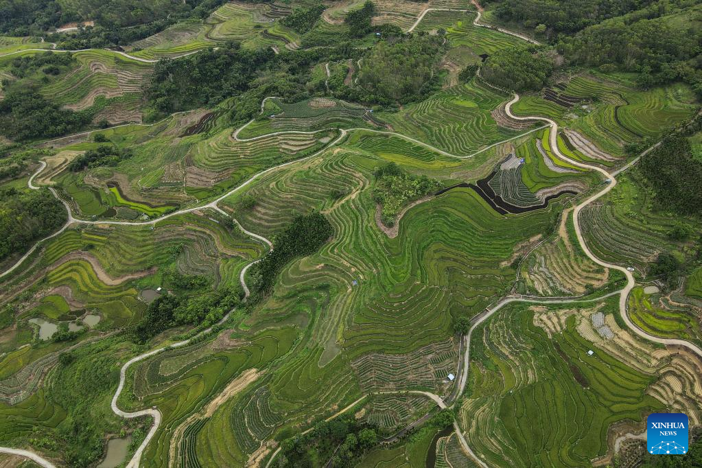 Aerial photo taken on May 18, 2022 shows a view of paddy fields in Shuiman Town of Wuzhishan City, south China's Hainan Province. (Xinhua/Zhang Liyun)