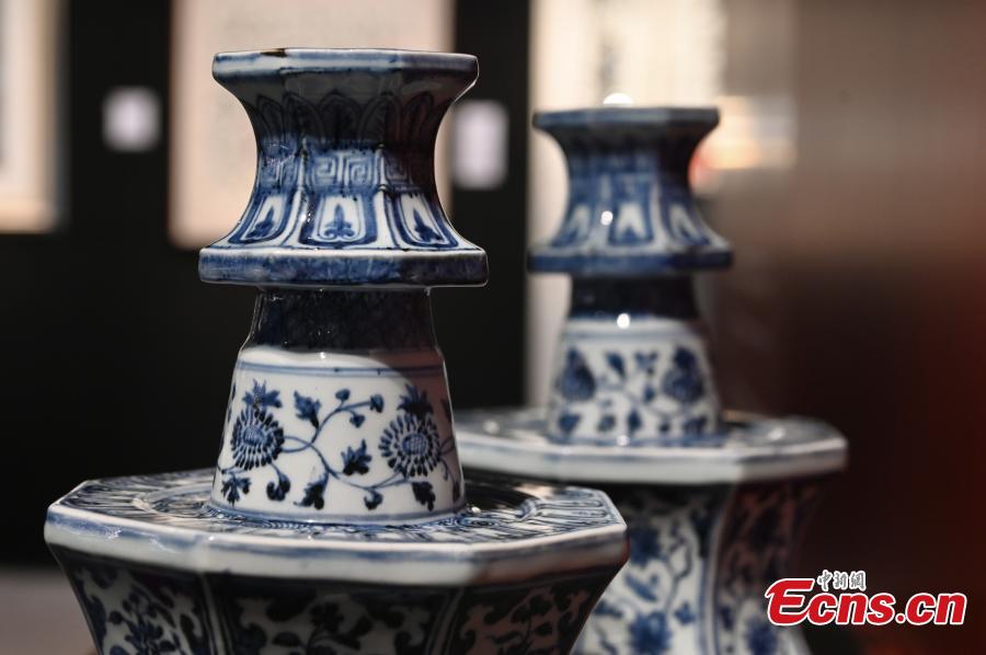 An exquisite pair of blue-and-white octagonal "floral" candlesticks from the Ming dynasty (1368-1644) Yongle period (r.1403-1424) are on display during a media preview at Bonham's, the Hong Kong Special Administrative Region, May 24, 2022. (Photo: China News Service/Li Zhihua)