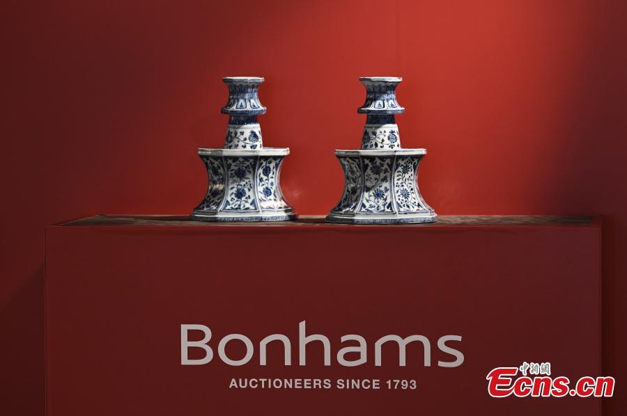 An exquisite pair of blue-and-white octagonal "floral" candlesticks from the Ming dynasty (1368-1644) Yongle period (r.1403-1424) are on display during a media preview at Bonham's, the Hong Kong Special Administrative Region, May 24, 2022. (Photo: China News Service/Li Zhihua)