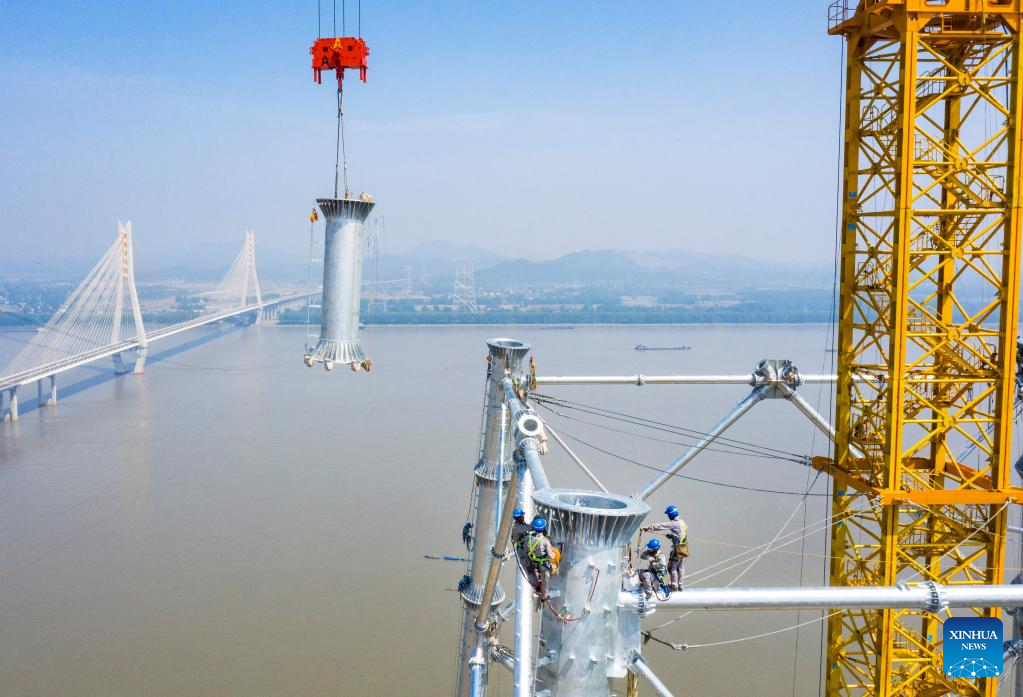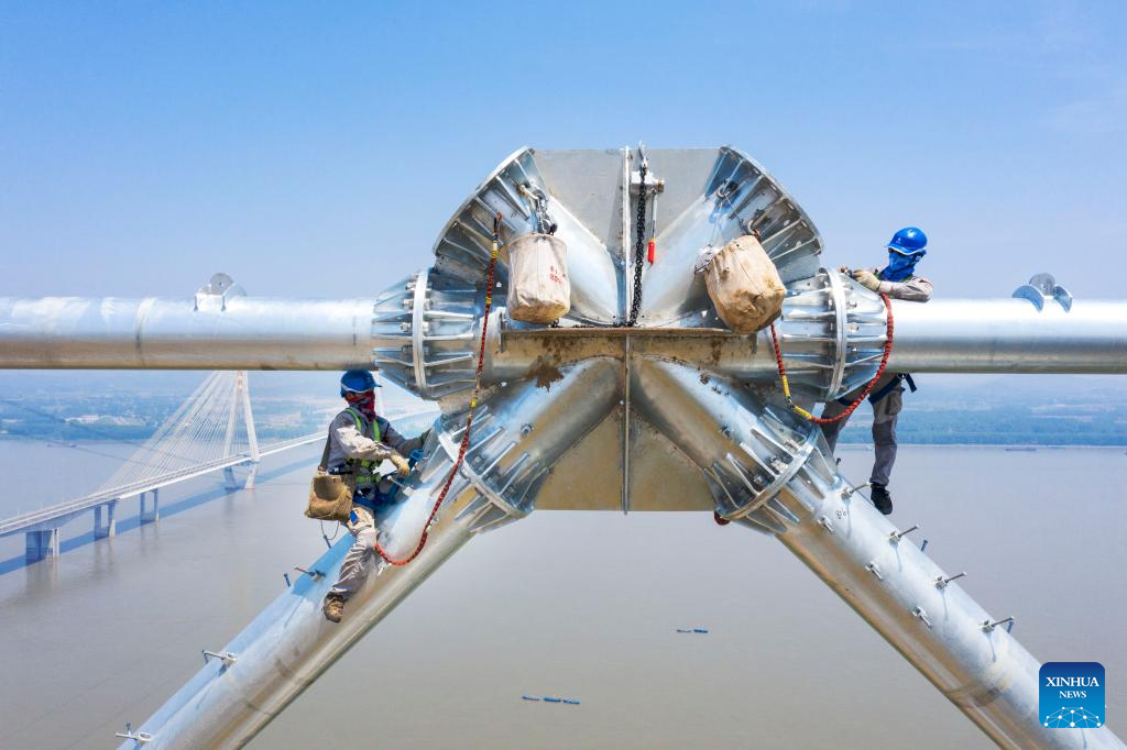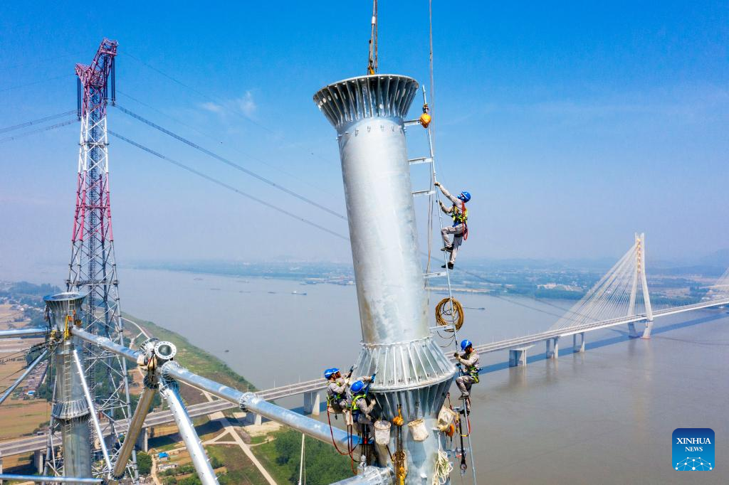 Aerial photo shows utility technicians working at the construction site of the Anhui section of Baihetan-Zhejiang ultra-high-voltage (UHV) power transmission project by the Yangtze River in Chizhou, east China's Anhui Province, May 25, 2022. (Photo by Zheng Xianlie/Xinhua)