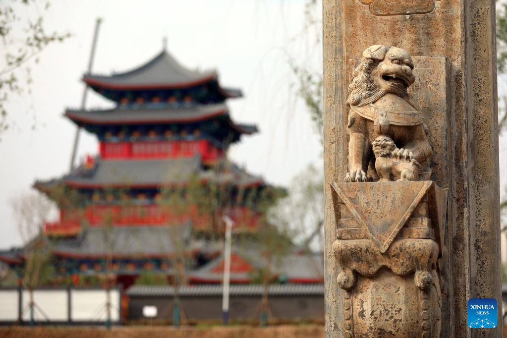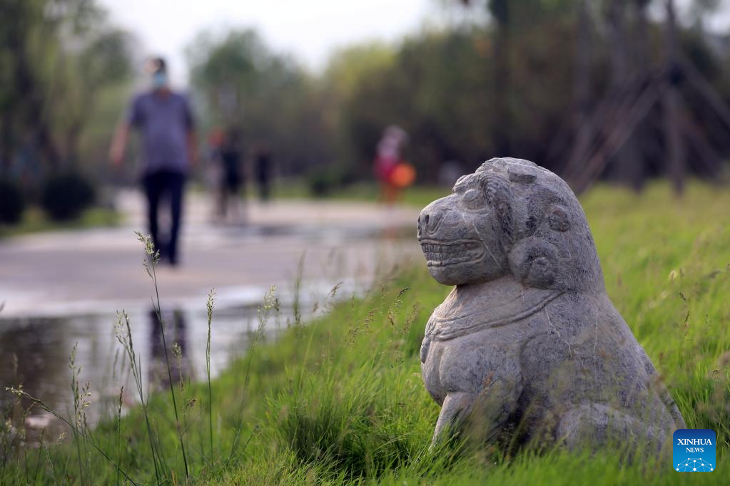Photo taken on May 24, 2022 shows a stone lion along the Grand Canal in Cangzhou City, north China's Hebei Province. (Xinhua/Luo Xuefeng)