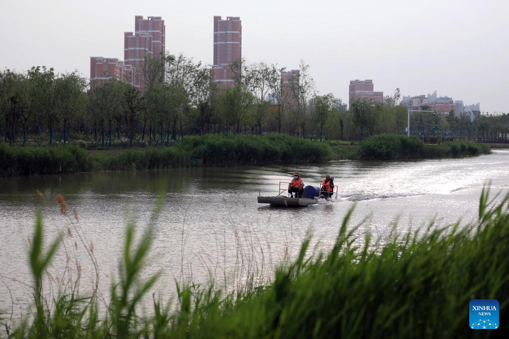 Staff members clean the watercourse of the Grand Canal in Cangzhou City, north China's Hebei Province, May 24, 2022. (Xinhua/Luo Xuefeng)