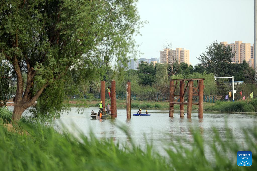 Workers are busy constructing a bridge over the Grand Canal in Cangzhou City, north China's Hebei Province, May 24, 2022. (Xinhua/Luo Xuefeng)