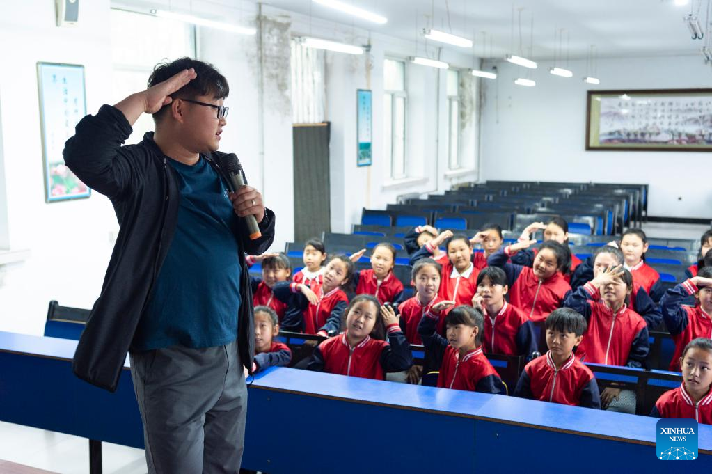 Teacher Zhang Yu teaches children in the music class at the Renmin Town Central Primary School in Anda City, northeast China's Heilongjiang Province, May 24, 2022. The music class of the primary school was founded in April 2019. Teachers of the class adapt the lyrics of popular songs to be suitable for children to sing, and then teach the songs to them during lunch break or club activity time.