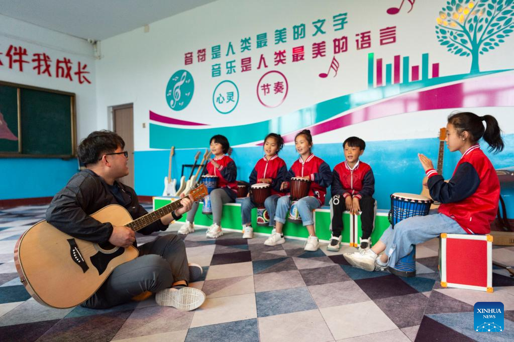 Teacher Zhang Yu (1st L) and children in the music class practice for band performance at the Renmin Town Central Primary School in Anda City, northeast China's Heilongjiang Province, May 24, 2022. The music class of the primary school was founded in April 2019. Teachers of the class adapt the lyrics of popular songs to be suitable for children to sing, and then teach the songs to them during lunch break or club activity time.