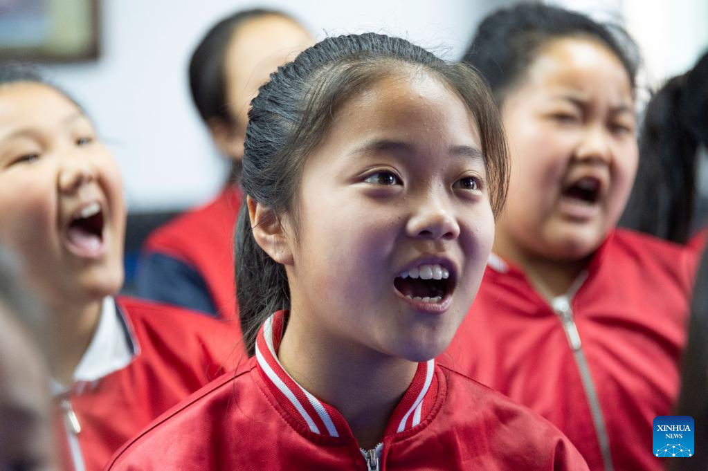 Children in the music class practice chorus at the Renmin Town Central Primary School in Anda City, northeast China's Heilongjiang Province, May 24, 2022. The music class of the primary school was founded in April 2019. Teachers of the class adapt the lyrics of popular songs to be suitable for children to sing, and then teach the songs to them during lunch break or club activity time.