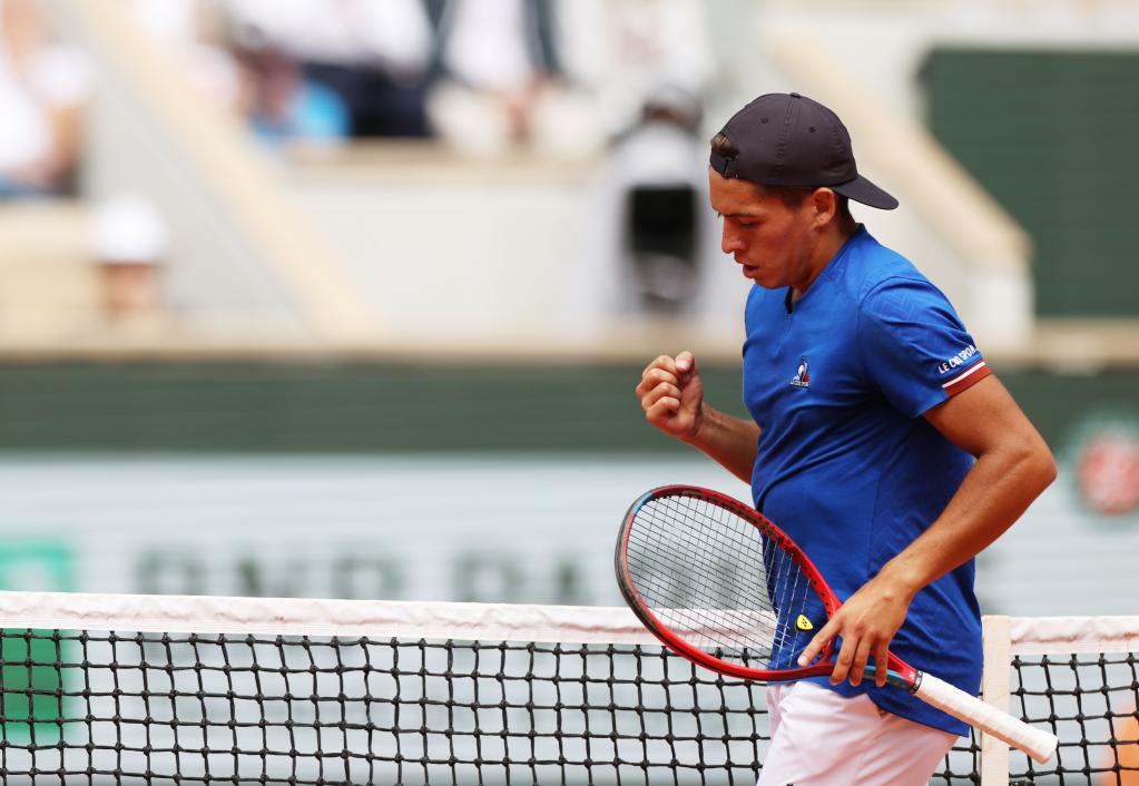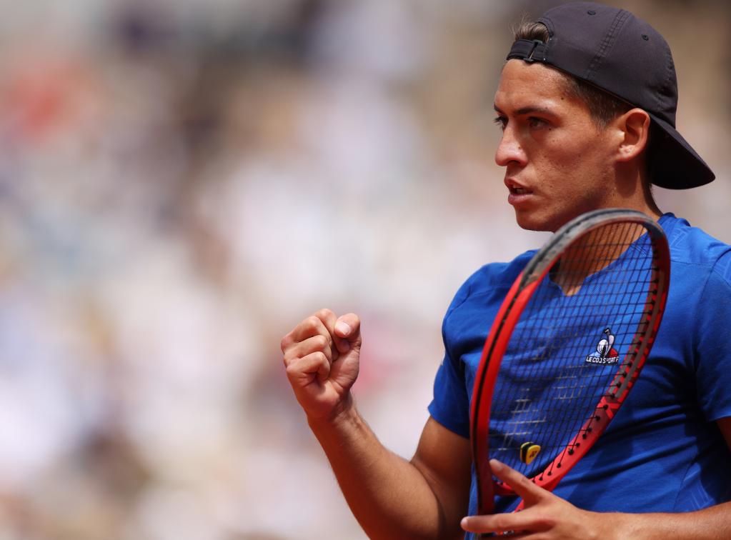 Sebastian Baez of Argentina reacts during the men's singles second round match between Alexander Zverev of Germany and Sebastian Baez of Argentina at the French Open tennis tournament at Roland Garros in Paris, France, May 25, 2022. (Xinhua/Gao Jing)