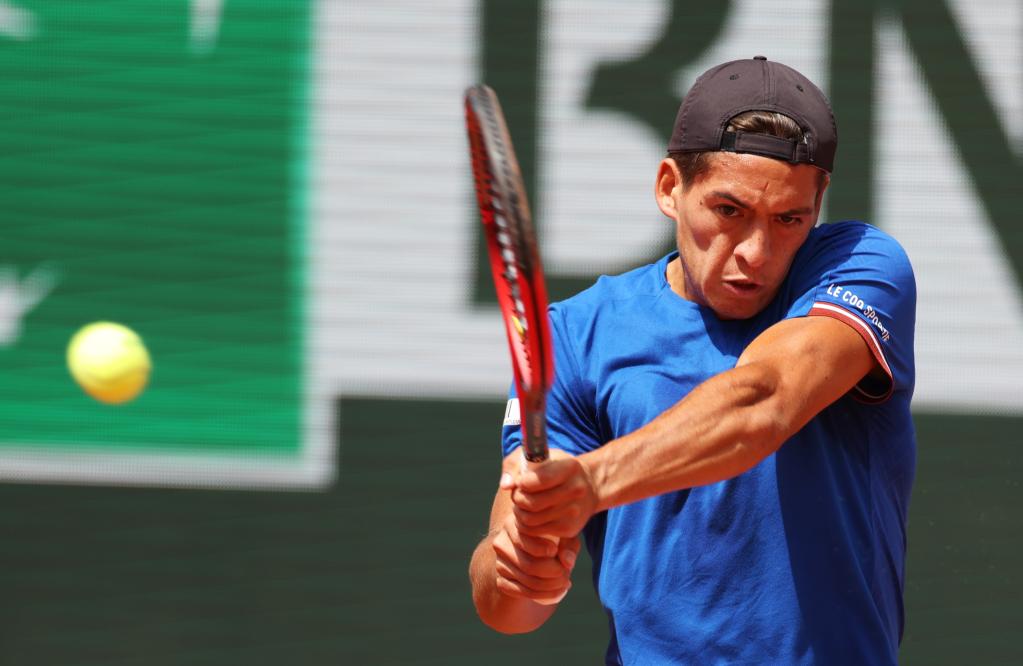 Sebastian Baez of Argentina hits a return during the men's singles second round match between Alexander Zverev of Germany and Sebastian Baez of Argentina at the French Open tennis tournament at Roland Garros in Paris, France, May 25, 2022. (Xinhua/Gao Jing)
