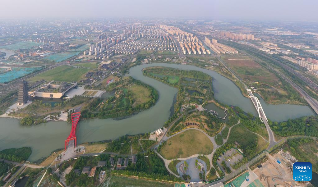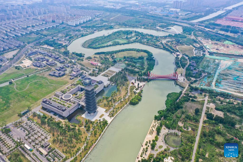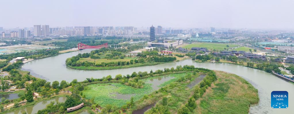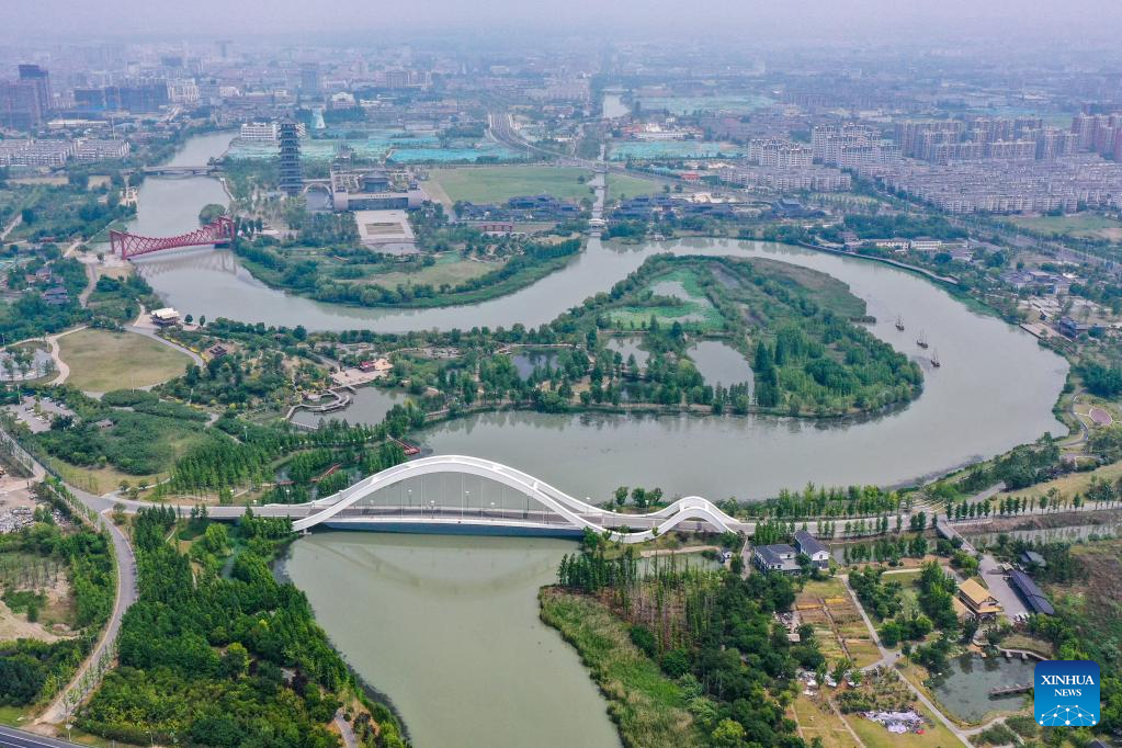 Aerial photo taken on May 25, 2022 shows the scenery of Sanwan canal scenic area in Yangzhou, east China's Jiangsu Province. Located in Sanwan section of the canal in Yangzhou, the scenic area has become a new tourist attraction since its opening to public in 2017. (Xinhua/Li Bo)