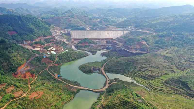 Photo taken on April 7, 2021 shows Pingqiao reservoir which is under construction in Anlong county, Qianxinan Buyi-Miao autonomous prefecture, southwest China’s Guizhou province. (People’s Daily Online/Liu Zhaofu)