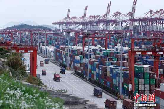 Container trucks travel back and forth as they shuttle shipments at the Yangshan Deep Water Port, Shanghai. (China News Service/Yin Liqin)